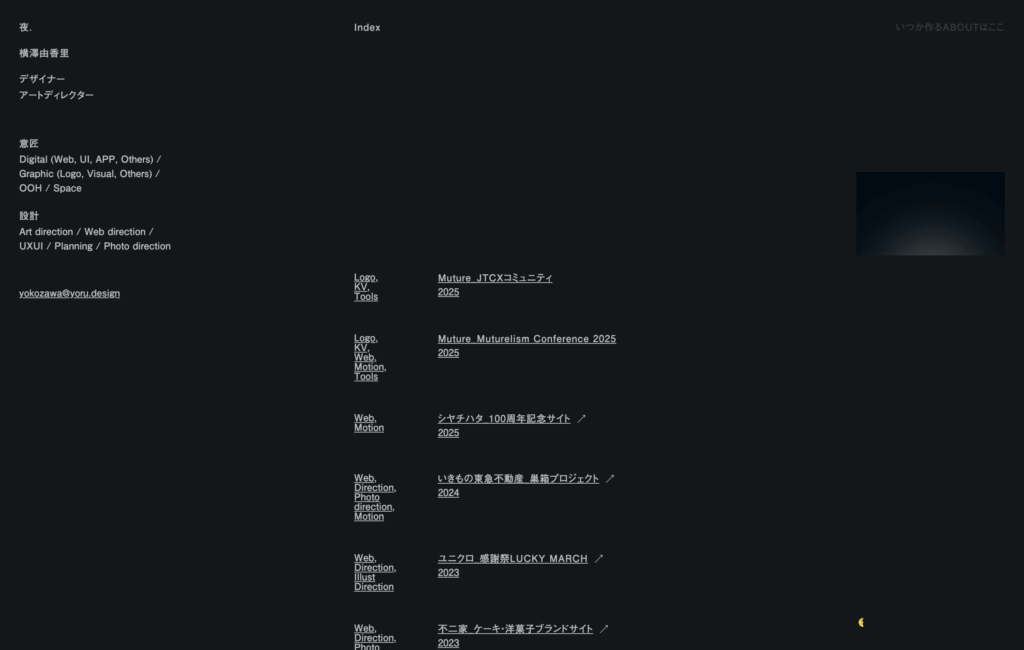 その余韻はサイトにも引き継がれていて、真っ暗な画面右下にお月さまだけが黄色く佇んでいて、月のかたちも変わっていきます。ホバーで表示される実績は、野外シネマを見ているかのような風情がありますね。