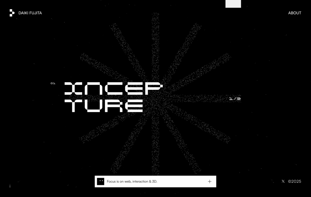 粒子パーティクル&デジタルなマウスストーカーが合わさることで発生する感覚体験。そこには技術を見せるだけではなく「体験性」のアイディアがある。ウェブデザイン、UI/UX、3D、インタラクション、アニメーション領域まで横断するデザイナーさんのサイトで、「機能性と創造性を調和させた体験を設計している」とのこと。PROJECT詳細における”NEXT”へ遷移する際の手動ローディング的な機能も新鮮な体験感覚でした。