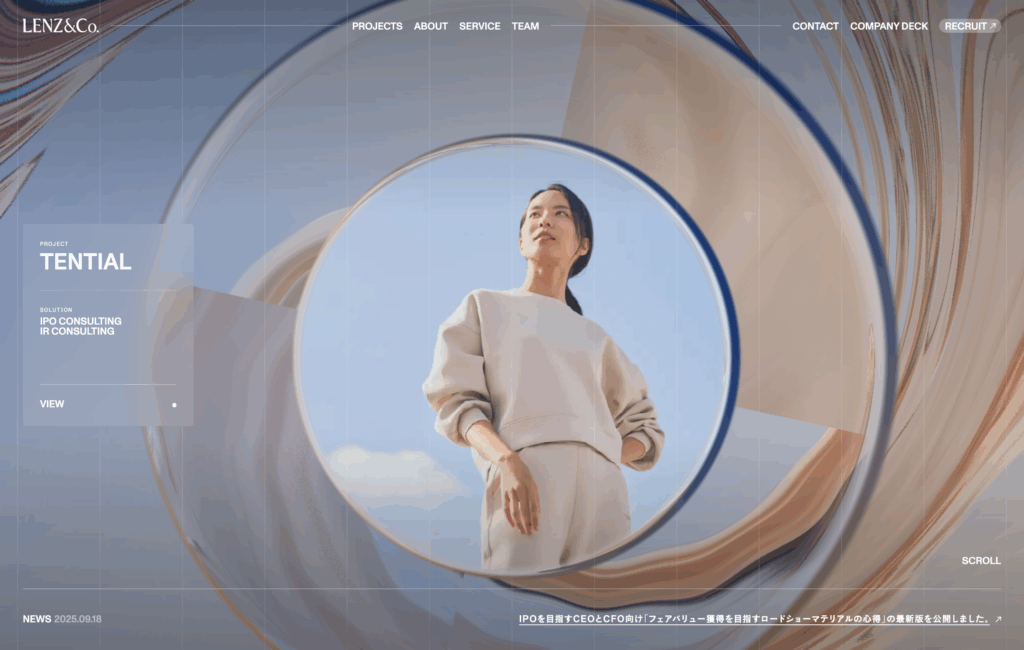 独特な雰囲気のMV。「LENZ&Co.」=レンズであり(合ってますか?)、異視=異なる視点という会社のテーマがビジュアルとして視覚的に表現されています。ABOUTでも「レンズ」「異視」といった伝わりにくいものを図形とモーションでわかりやすく伝えていて、視覚的に理解がしやすいと感じました。PROJECTでのテキストの強調、スライド資料の展開、クライアントインタビューの統合など、コンテンツの充実度が印象に残りました。