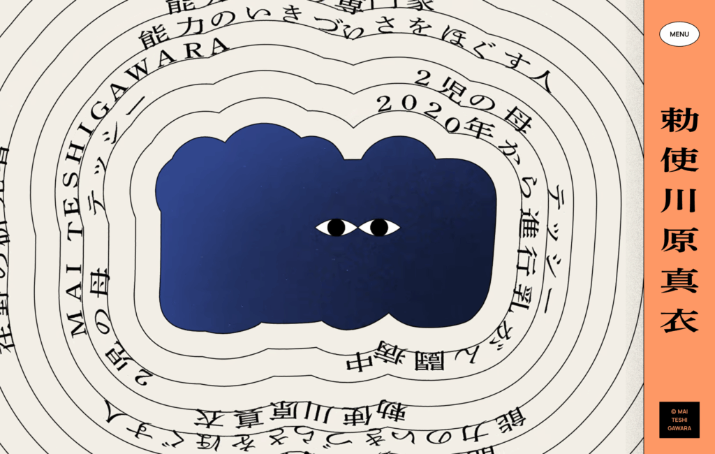 「いい感じでやな感じ」をテーマにつくられたという、勅使河原麻衣さんのサイト。MVでは文字がうようよ動き、不思議なキャラクターは眼をぎょろぎょろ。うようよ文字には勅使河原さんという人を知るためのキーワードが。面白いのは「能力主義」「組織開発支援」「学歴社会」など、文字面だけ見るとやや重めに感じてしまうワードに対して、サイトはポップに振り切っているところです(文字は明朝体にすることでバランスを取っている)。そうすることで、前述のワードだけでは窺い知れない勅使河原さんの「ポップな一面」が感じ取れる(私はラジオを聴いていてそう感じました)。「社会性」と「人間性」、ふたつでひとつの人間であることを表現したサイトですね。