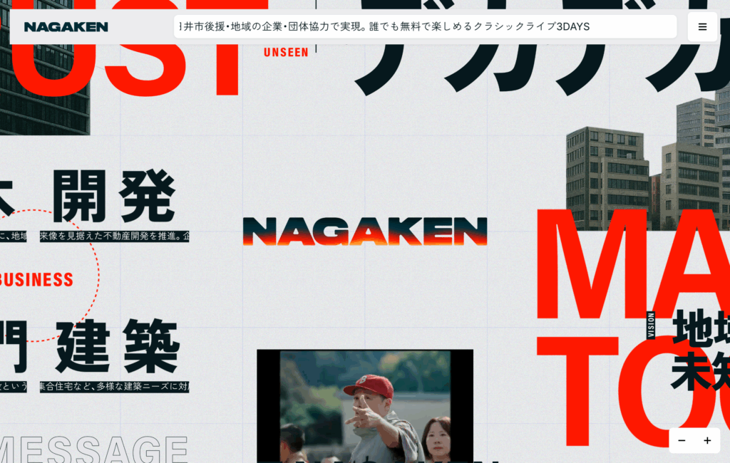 建設会社NAGAKENのサイト。サムネイルを見ると分かりますが、全体像がブラウザ画面よりも広く、ドラッグで全体を見ていくスタイル。「新しいことデカデカと」というコピーとともに、従来の枠でおさまらない「度量」や「挑戦」を感じさせるトップページになっています。
