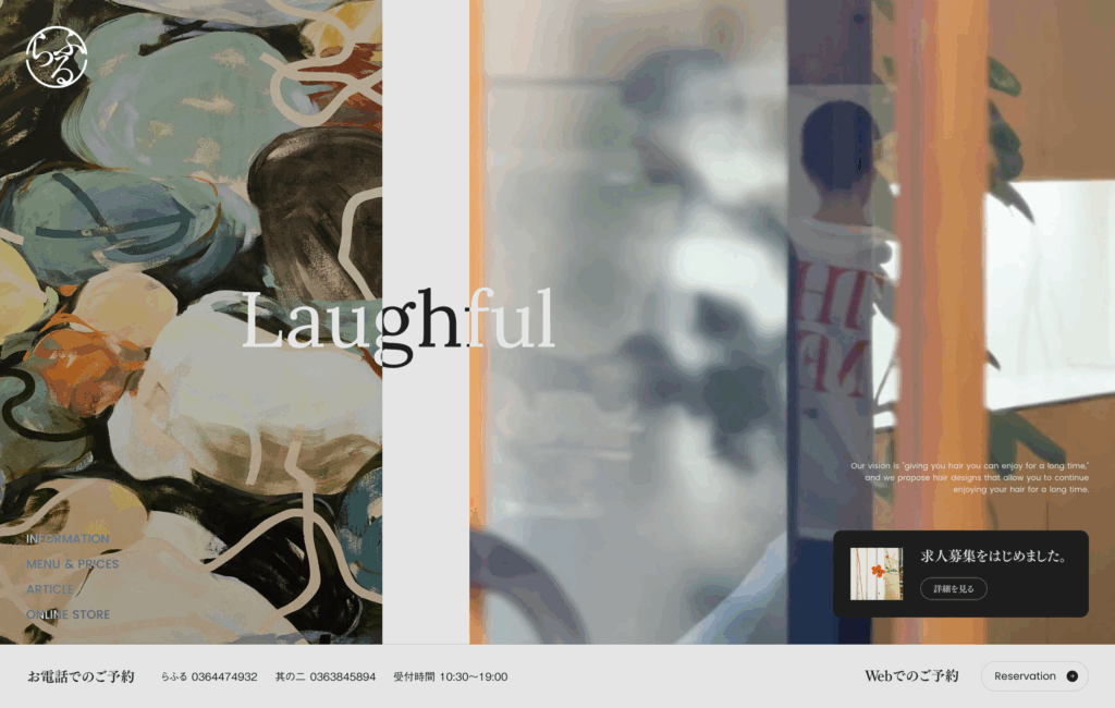 美容室「らふる」のサイト。特徴的だと感じたのは、旅や写真といった「らるふスタッフ各々の嗜好性」がウェブサイトに反映されているところ。ブランドイメージをかたちにするにあたって、スタッフさんの趣味嗜好の交差するぼんやりとしたかたちを「らるふ」と位置づけている。