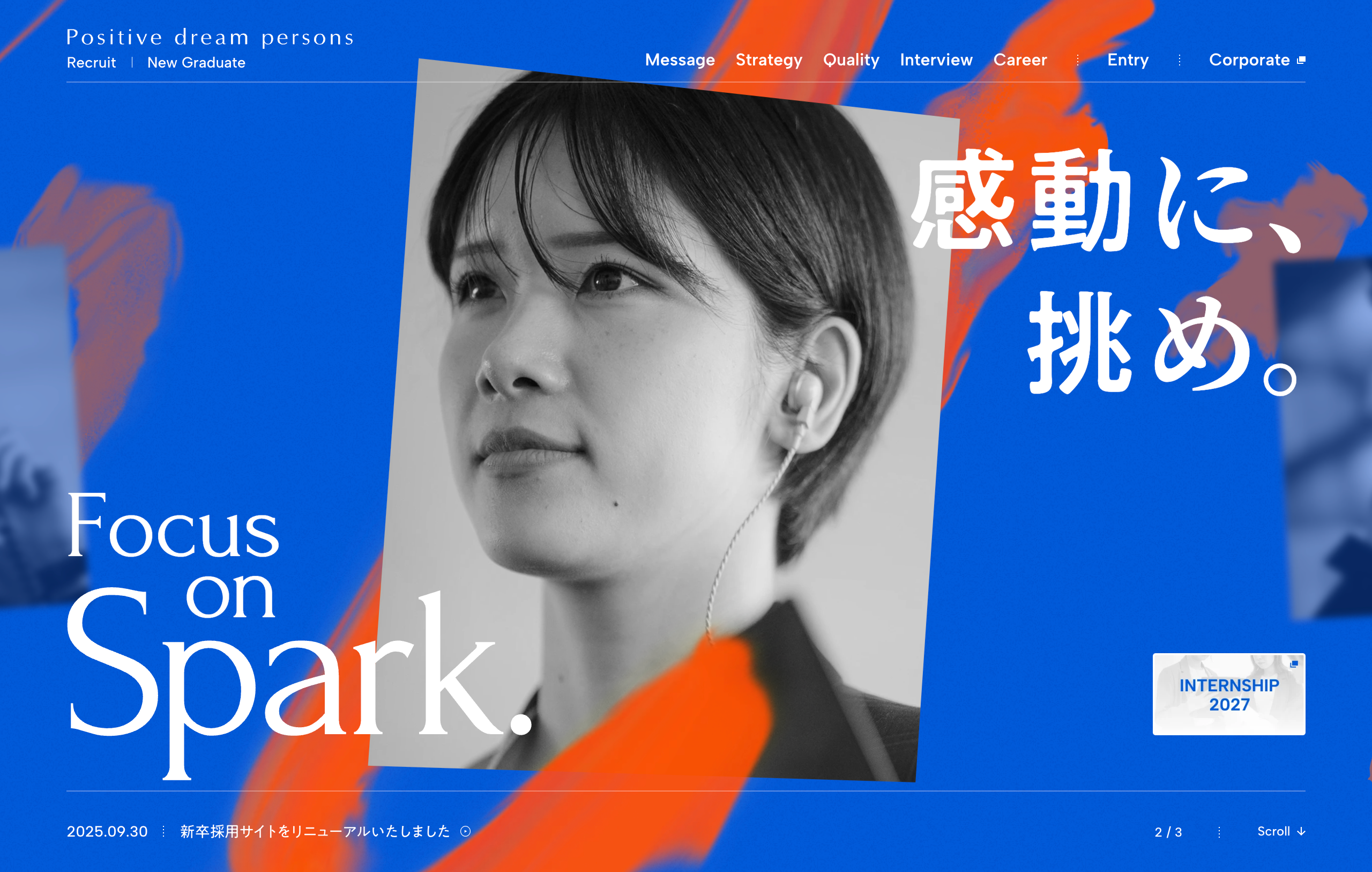 ポジティブドリームパーソンズの採用サイト。鮮やかなブルーを背景に、筆のように力強いオレンジのラインが印象的です。画面いっぱいに記されたメッセージからは情熱的な会社の姿勢が伝わってきますが、ブルーがベースにあるからかクールな「知性」と熱い「情熱」が共存しています。リンク先のアニメーションなど、細やかなところの配慮にも知性が。また、このサイトは採用サイトでありながら、企業のブランドや情報を伝えていくという意味においてはコーポレートサイトとしても成立しているように思いました。チャレンジングなことができるコーポレートサイト、という位置付けで採用サイトを捉えてみるとまた面白いかもしれませんね。