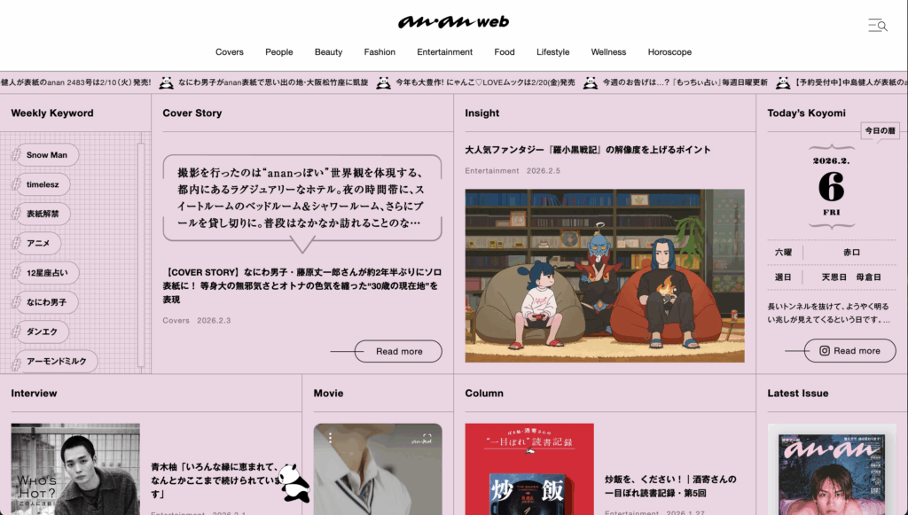 Tarzanが身体を軸にするなら、ananは心や感情を軸にした雑誌です。1970年の創刊以来、恋愛、性、心理、占い、健康、エンタメと、感情や生き方に踏み込む特集を打ち出してきました。Webサイトは雑誌の補完を超えて、Web独自のメディアとしての完成度があります。
