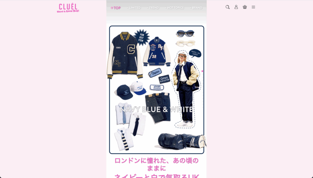 リンネルがスマホを意識した設計なら、CLUÉLはさらにスマホに振り切っています。ファッションを「憧れ」ではなく日常の延長として楽しむCLUÉL。Webサイトは淡いピンクを基調に、スマートフォンサイズの縦長ビジュアルでSNSの感覚そのままの構成になっています。