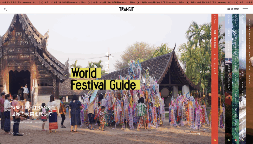 同じく土地に注目する雑誌として、旅をテーマにしたTRANSIT。観光情報を網羅するのではなく、その土地の文化や暮らしを深く掘り下げてきた雑誌です。Webサイトでもその姿勢は一貫していて、大きなビジュアルと余白を活かしたレイアウトから、誌面のリズムがそのまま感じられます。
