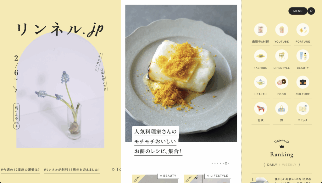 BRUTUSと同じく、スマホでの閲覧を意識した設計になっているリンネル。訪れるたびに季節の花々が彩りを添える「花ごよみ」エリアが印象的で、週ごとに模様替えされるこのスペースが、サイト全体にやわらかい空気感を生んでいます。