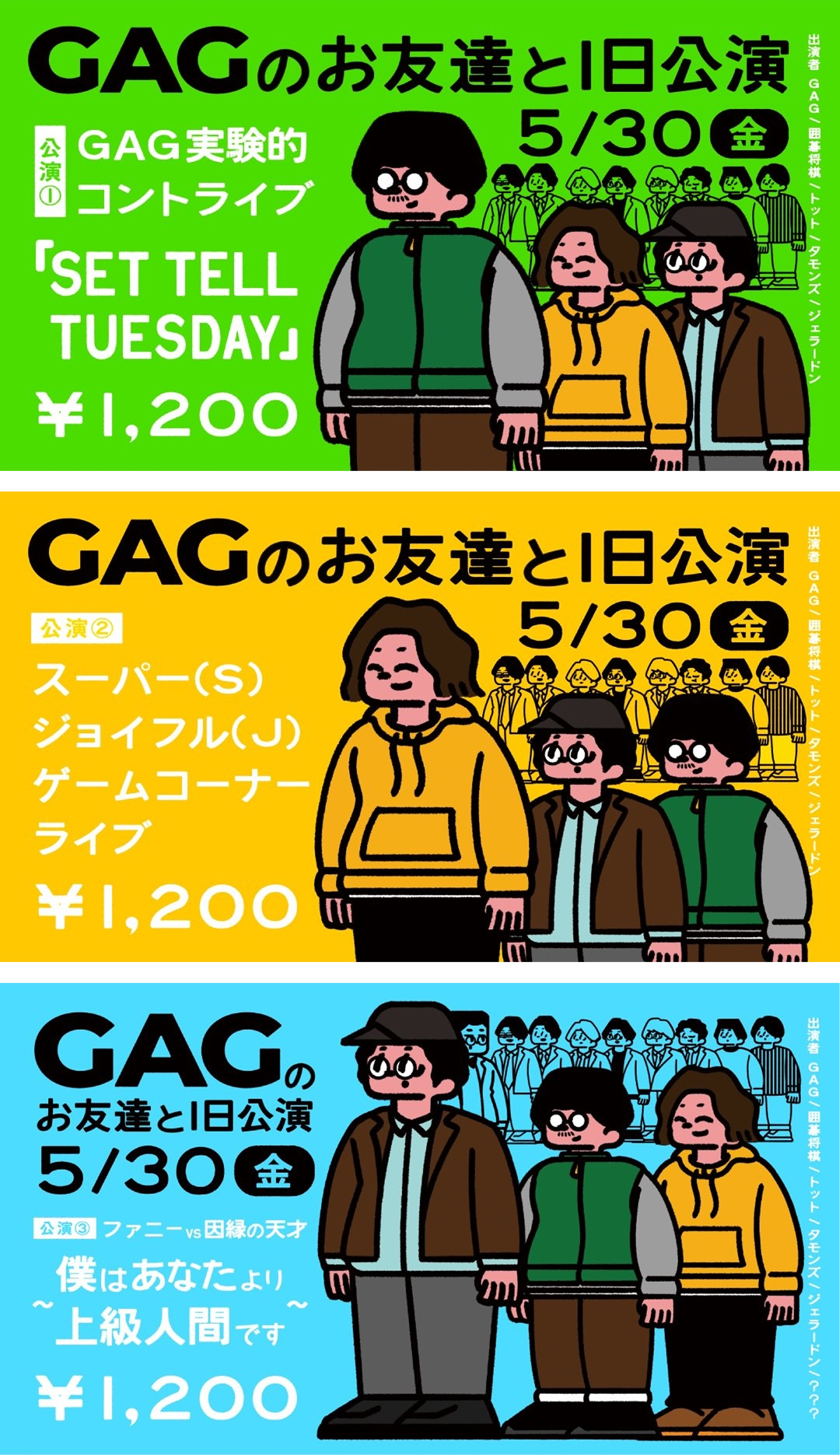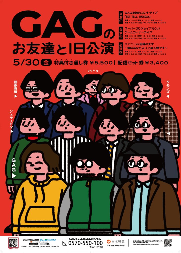 前回の記事でもGAGをピックアップしましたが、『GAGのお友達と1日公演』のフライヤーは、前回とはまったく違う雰囲気です。SUSHさんのイラストで、芸人さんたちがずらりと並び、これまでのGAGの印象とはまた少し違って、この企画そのもののにぎやかさが前に出ている感じです。全員が等しく描かれているのも、この公演ならではの距離感だなと思います。(OMIMU)