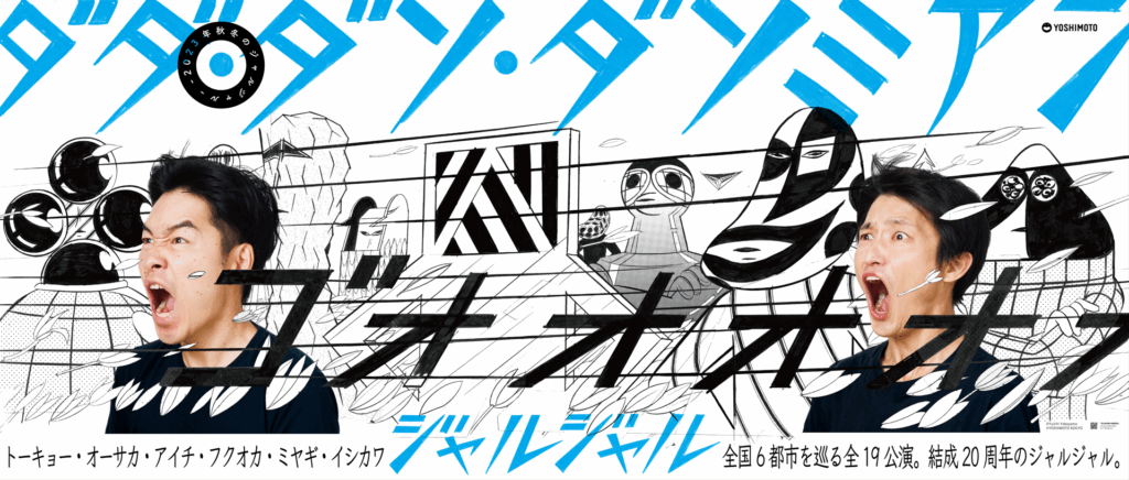 こちらも前回に続いてラランド。ジャルジャルと同じくふたりを主体としたビジュアルなんですが、こちらは普段のラランドの姿ではなく「斬新なビジュアルイメージ」で「新しいラランド」を表現。この普段のラランドとの鮮やかなるギャップが、このフライヤーに惹きつけられてしまう大きな理由ではないでしょうか。『爆爆』のこのふたり、確実にどこかの漫画に出てくる悪役ですよね。どちらもデザインは、2023年の『冗談』に続いてアートディレクター、デザイナーのShimpei Umedaさんが担当しています。(仲村)