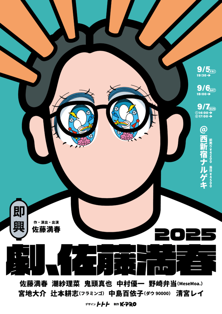 お笑い芸人でありながら、放送作家、ラジオパーソナリティと複数の肩書きを持つ佐藤満春さんのプロデュース公演ポスタービジュアル。佐藤さんはこれらのライブの根底にあるものとして「何でもない普通の男が普通のことをする」というテーマを持っており、『劇、佐藤満春 第0章』『劇、佐藤満春 第1章』のポスターでは佐藤さん自身の顔のアップなんですが、なんと写真が逆さ。ちょっと変な、センス芸人的個性が垣間見えるところが印象に残ります。『-即興-劇、佐藤満春2025』ではイラストになってます。デザインは毎回トトトさんが担当しています。(仲村)