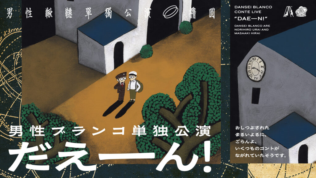 男性ブランコのポスターはイラストレーターを起用したものが多いです。どのポスターも、男性ブランコのふたりを全面に押し出すというよりは俯瞰した「世界観」に重点を置いており、その世界観づくりをイラストレーターさんが担当することで、よりその世界観に深く引き込まれてしまう。そこが面白いですね。宣伝美術を担当している川名潤さんや、『嗚呼、けろけろ』で宣伝画を担当した網代幸介さんも、もともとは各公演の構成にかかわっている「ワクサカソウヘイさん」からのご紹介だったそう。(仲村)