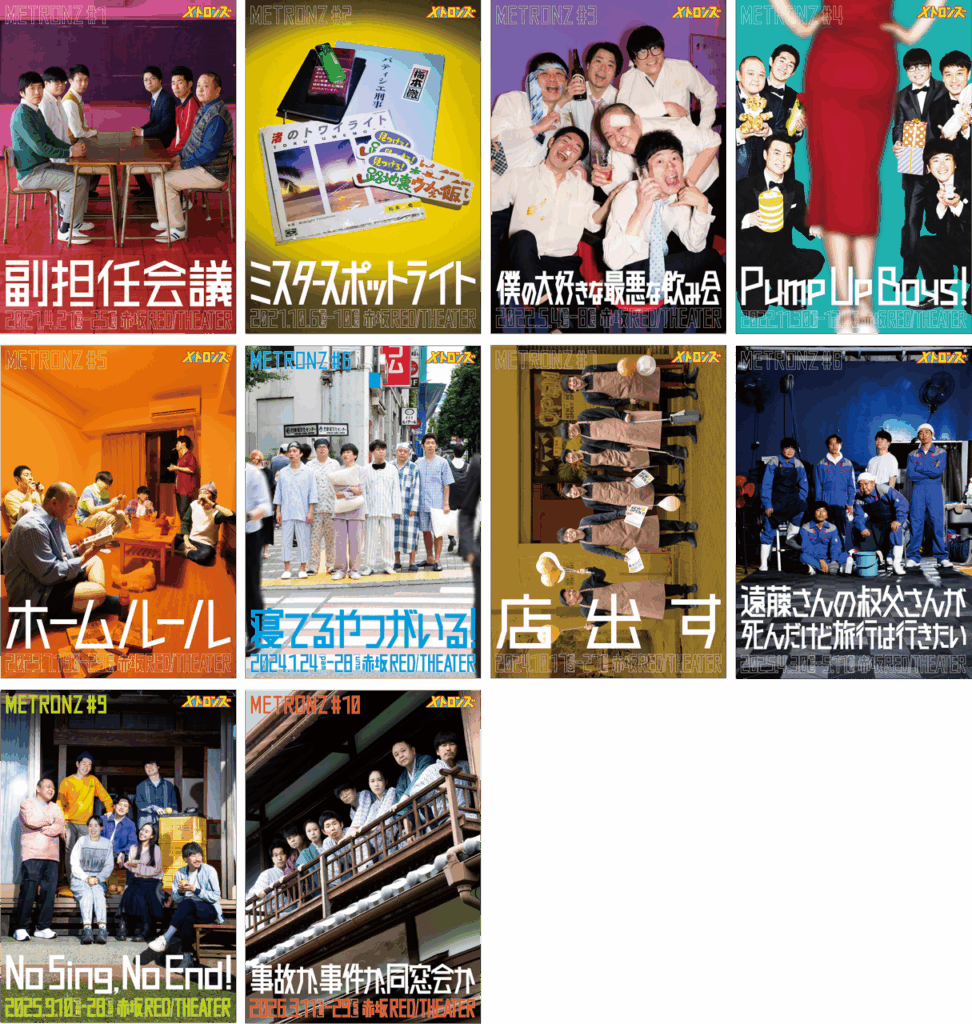 メトロンズの公演フライヤーは、一枚一枚が派手というより、シリーズで並べてこそ“じわっと効いてくる”タイプのビジュアルです。毎回おなじみのロゴとタイポなので控えめに見えるのに、回を重ねるほど作品としての味わいが増していくんです。また、#2では演者不在、#7は横向き、#9以降は客演女優が加わったりと、写真の扱いを通じて作品世界がアップデートされていくのも面白い。どの回も“日常の少しズレた空気”を丁寧に写しとっていて、コント師が演劇をするという似て比なるものをうまくビジュアルに落とし込んでいる気がします。(OMIMU)