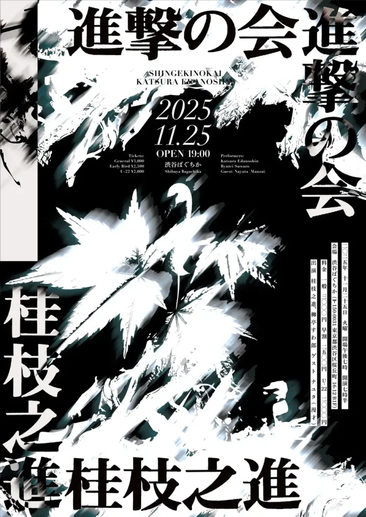 落語のフライヤーといえば、噺家さんの顔がどんと前に出るものが多い印象ですが、ここで挙げた2つはその真逆。人物を出さず、文字やモチーフだけでつくっているのが新鮮です。ビジュアルだけを見ると、伝統芸能というより現代アートやイベントのフライヤーのようです。伝統芸能でありながらこうした見せ方でも違和感がないところに、落語というジャンルの幅の広さみたいなものを勝手に感じています。(OMIMU)