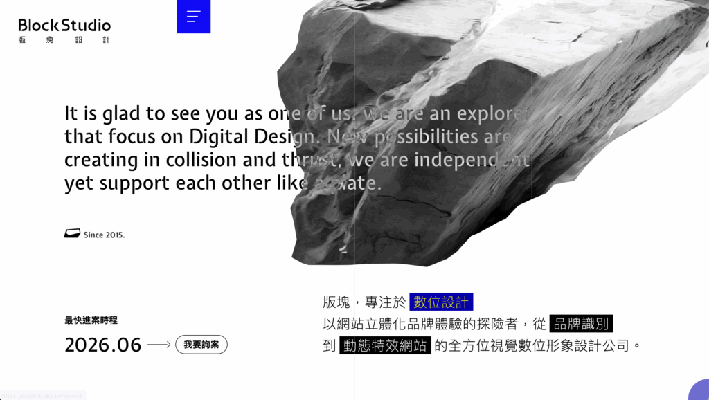ここからはWebデザイン寄りのスタジオを紹介します!「地殻のプレートがぶつかり合い、動き続けることで新しい地形が生まれる」そんなフィロソフィーを掲げ、2015年の創業から10年以上、台湾のWebデザインシーンで確固たる存在感を放っているBlock Studio。
