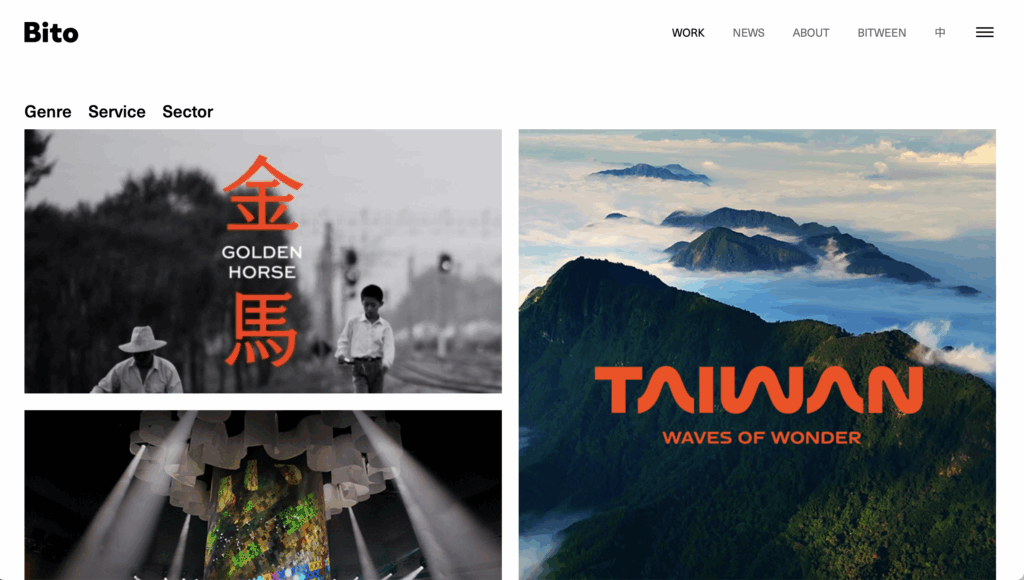 続いては、今年ちょうど10周年を迎えるWhitelight Motionです。ブランディング・フィルム・モーションを横断するスタジオで、Red Dot・iF・香港DFAなど国際的な受賞歴も豊富です。台北映画祭、台北デザイン賞、台湾の公共テレビ局の配信サービス・PTS+のリブランディング、金曲奨と、文化・公共機関の案件も目立ちます。