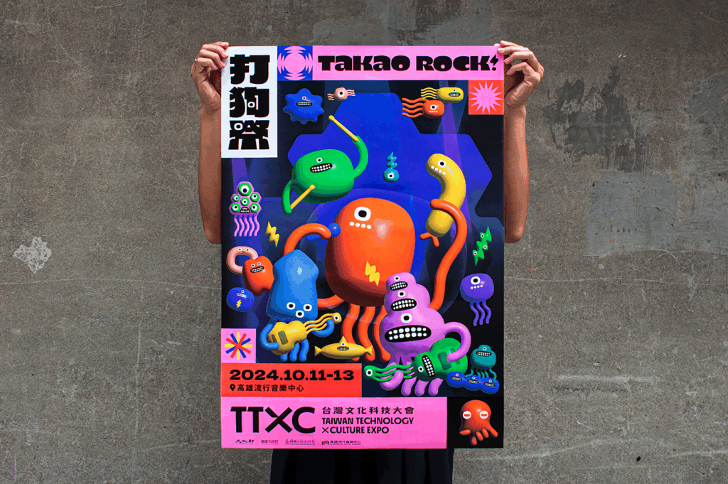 高雄流行音楽センターが主催する大型音楽フェスのビジュアル。2022年から毎年Onion Designが担当しており、宇宙から高雄港湾に飛来した小怪獣キャラクターたちが港や船・貨物コンテナなど高雄らしい要素と混じり合う、ポップで独特の世界観が定着しています。
